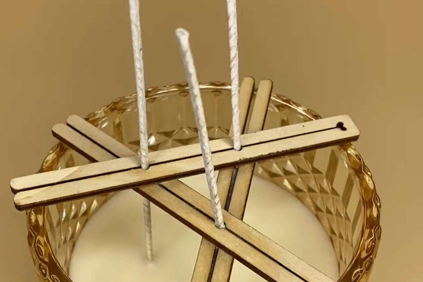 • Второй конец зафиксируйте на палочке и положите её сверху формы, чтобы фитиль стоял ровно посередине.
